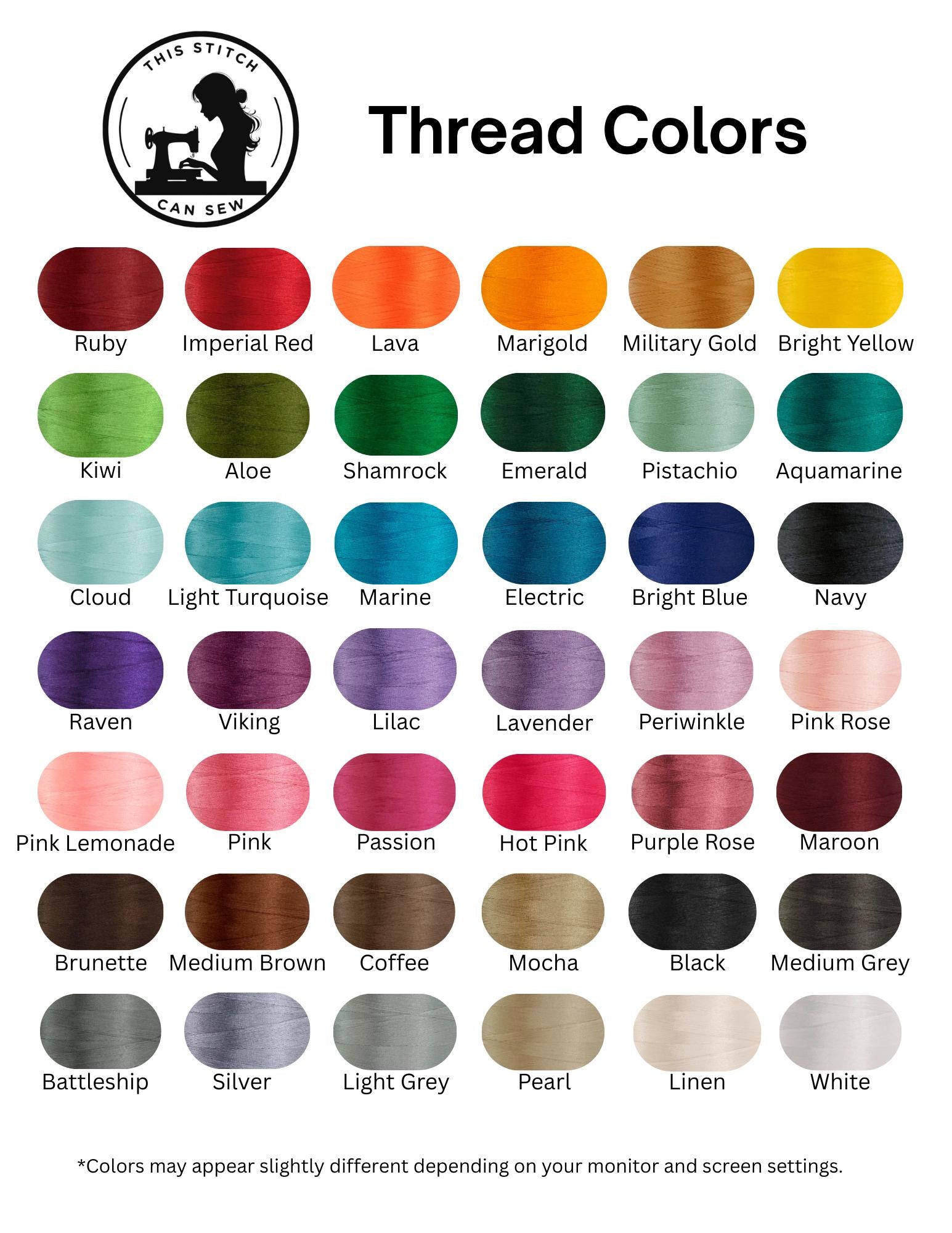 • Embroidery thread color will match your selection or coordinate if unspecified
